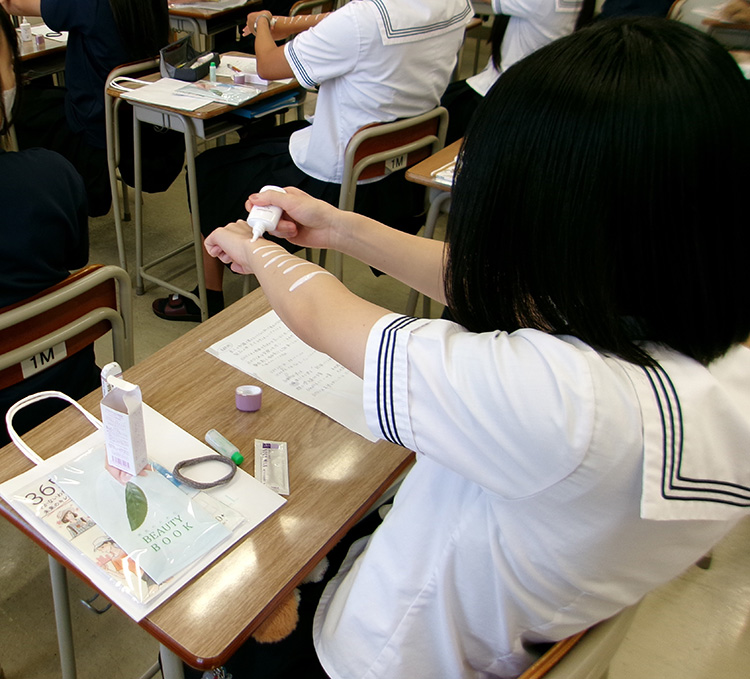 ・日やけ止めの選び方や適量・塗り方・再塗布を美顔師が実演、生徒も体験
