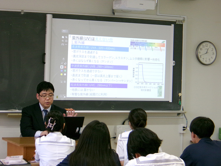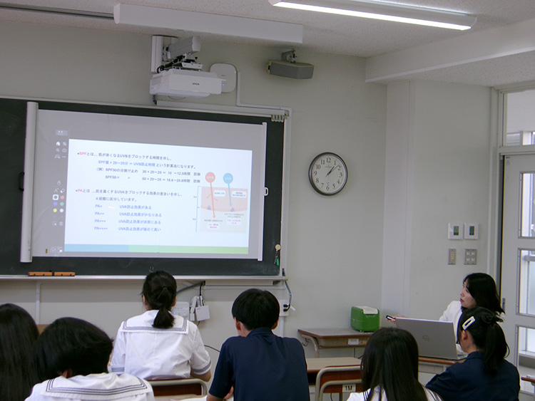 本授業では、皮膚科医が「光老化のメカニズム」を医学的に解説し、美顔師が「日やけ止めの正しい使い方」を実演しました。