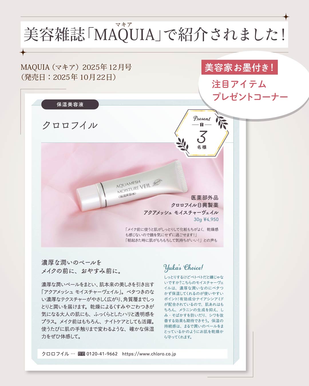 美容雑誌「MAQUIA(マキア)」のプレゼントコーナーにピックアップされました!