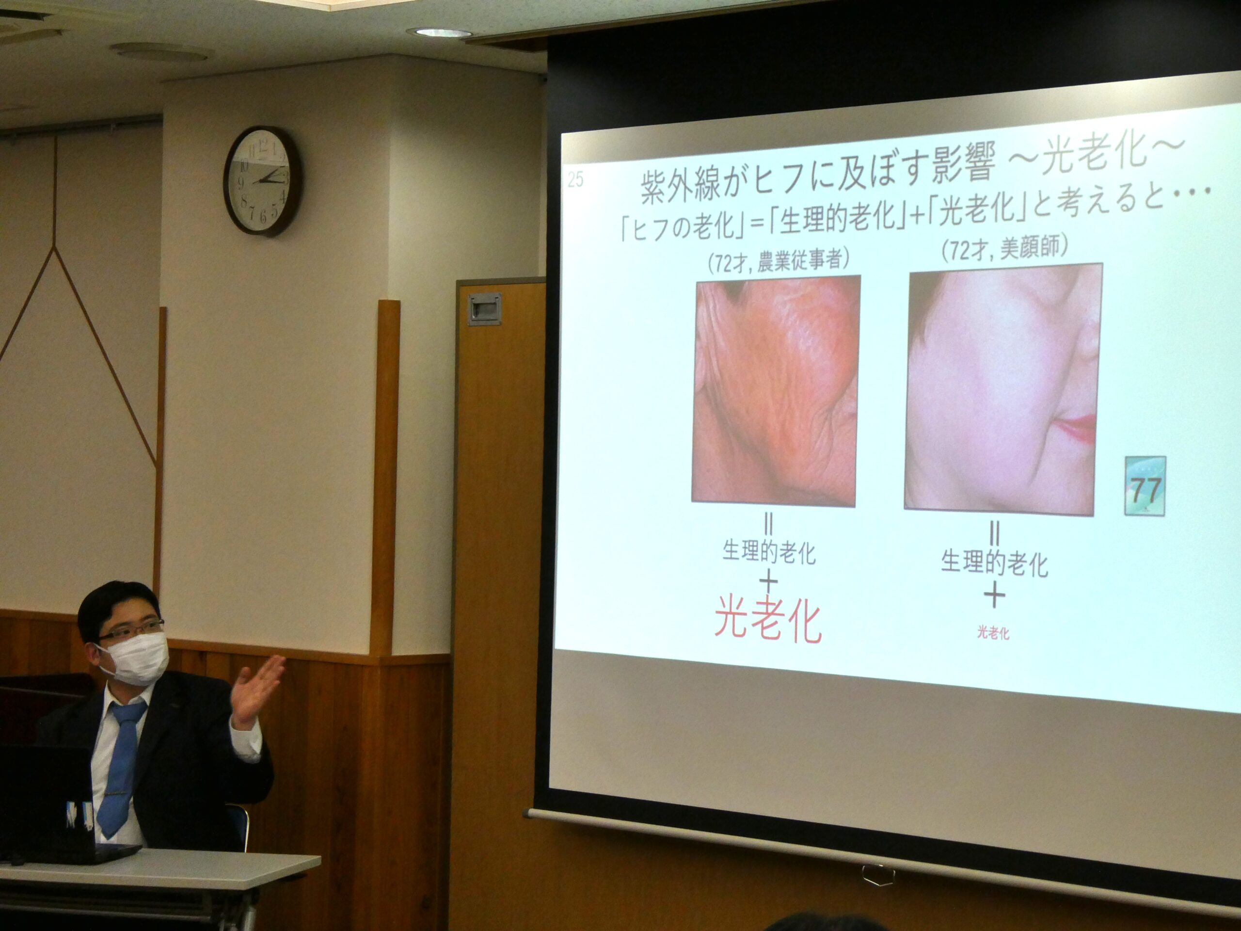 当日はまず、皮膚科医が紫外線の基礎知識、光老化のメカニズム、肌への影響について医学的視点から解説。続いて、美顔師が日常生活で取り入れやすい紫外線対策や実践的なケア方法を、身近な例を交えて紹介しました。